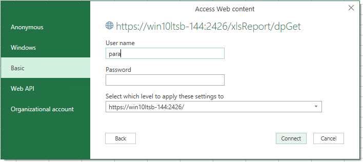 - Make sure have a valid certificate for your webserver, otherwise Excel prevents the connection. If this is not possible, you need to use http.